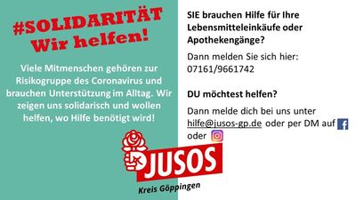 Um die weitere Ausbreitung des Corona-Virus zu verlangsamen und damit uns alle zu schützen, ist unser aller Hilfe und Solidarität nötig. Insbesondere ältere Menschen und Menschen mit Vorerkrankungen sind einem besonderen Risiko ausgesetzt und sollten möglichst zu Hause bleiben. Um die Versorgung unserer Mitmenschen zu sichern, hat der Juso-Kreisverband Göppingen eine Hilfevermittlung eingerichtet.